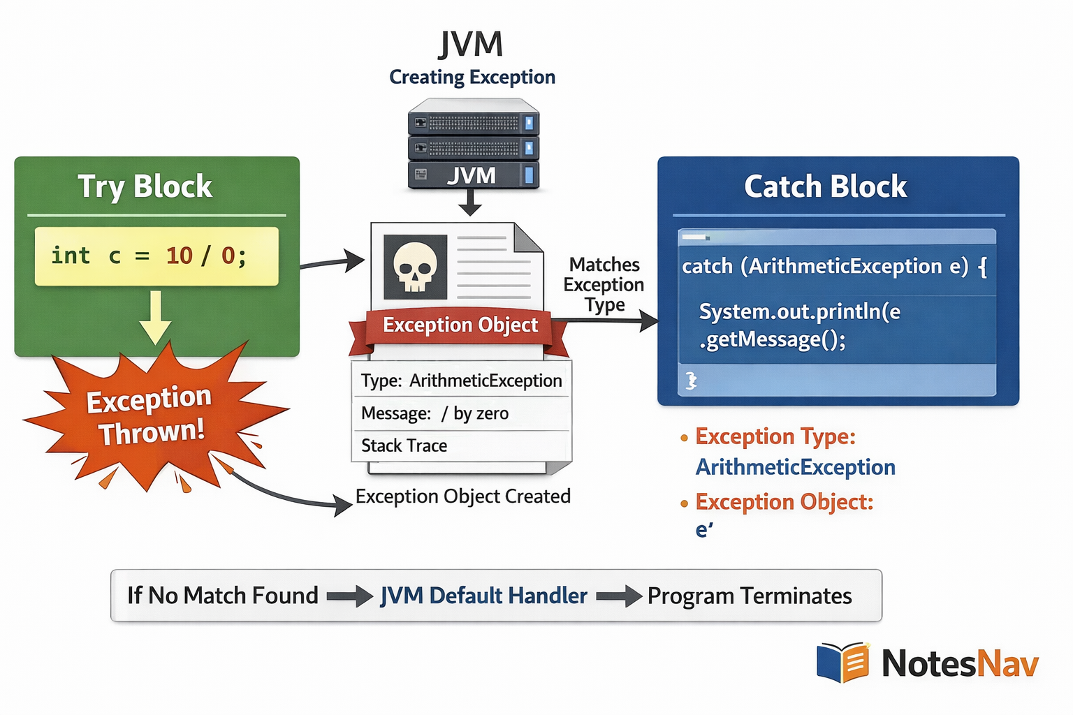 If no match → JVM default handler runs → program terminates